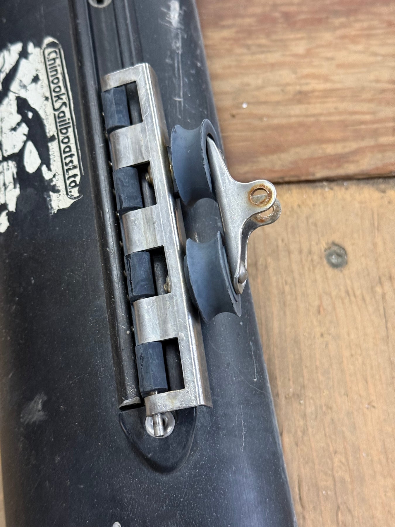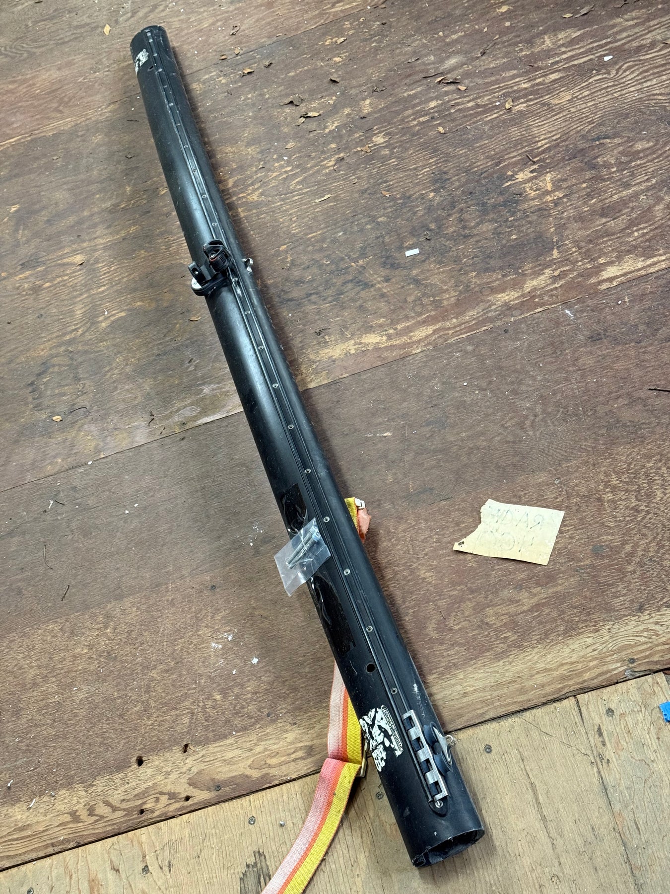 black annodized crossbar in great shape. It has the raised traveler track and a newer swivel cleat installed.